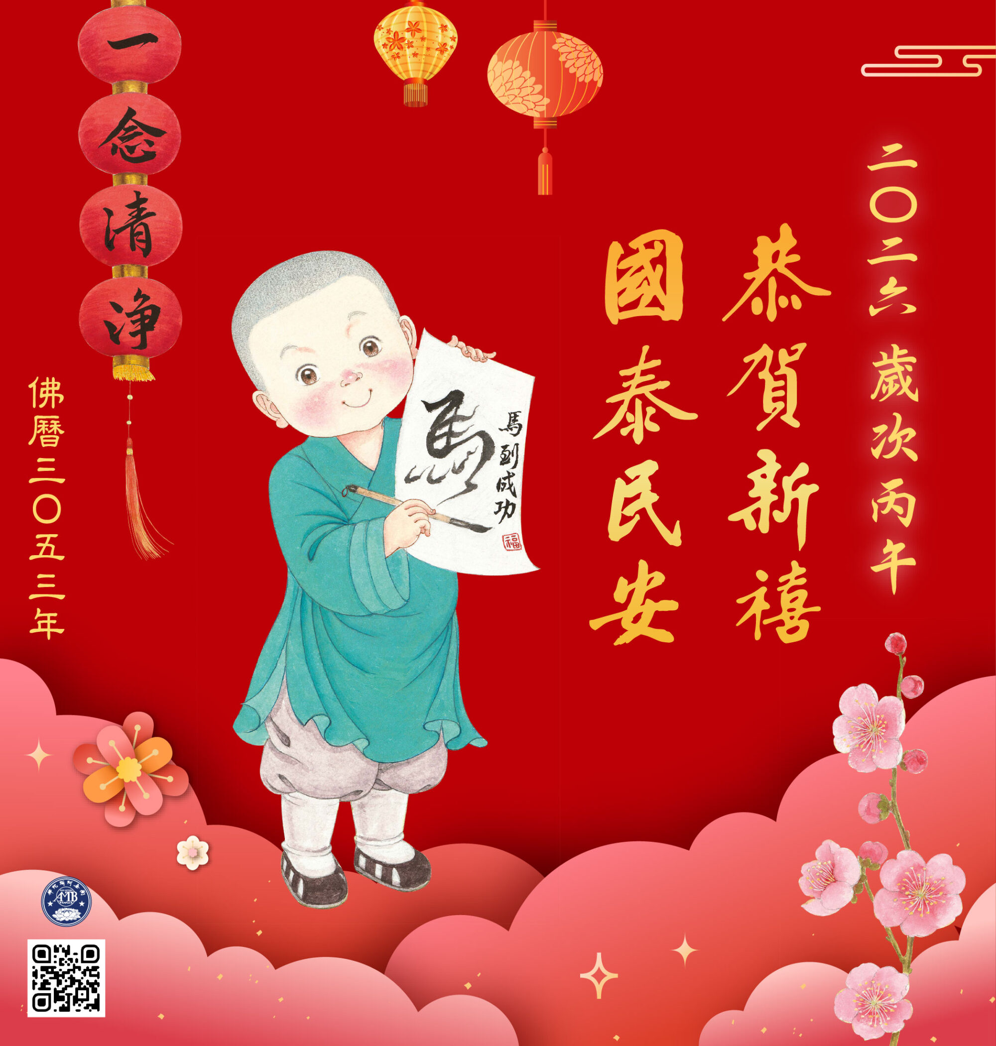 最後,祝福大家,新春愉快,六時吉祥,淨滿圓成,光壽無量!祝福佛教與傳統文化,復興光大,全球弘揚,千秋萬世,廣度有情!祝福國家,國泰民安,國運昌隆!祝福世界,安定和平,永續大同!