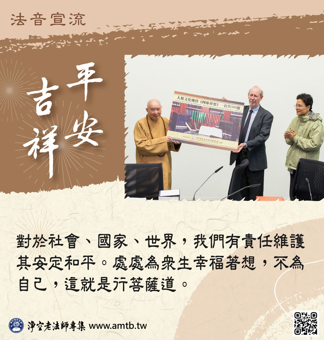 ◎ 一個族群不能包容其他族群,就會有族姓之間的械鬥;一個國家不能包容其他國家,就會發生戰爭。要解決這些問題,心量一定要大,起心動念都要想到一切眾生,要互相尊重,互相敬愛,互助合作,才能消除一切誤會、矛盾、隔閡、歧見,世界才真正得到和平安定。若念念只為自己的利益,忽視對方的利益,忽視人類整體的利益,縱然天天喊世界和平,也只是一句口號,不能落實。因此,心胸狹窄之人無法解決問題。世界上各個族群、國家的領導人,一定要拓開心量,念念為全世界一切苦難眾生著想,安定和平才能落實。(981214早餐)