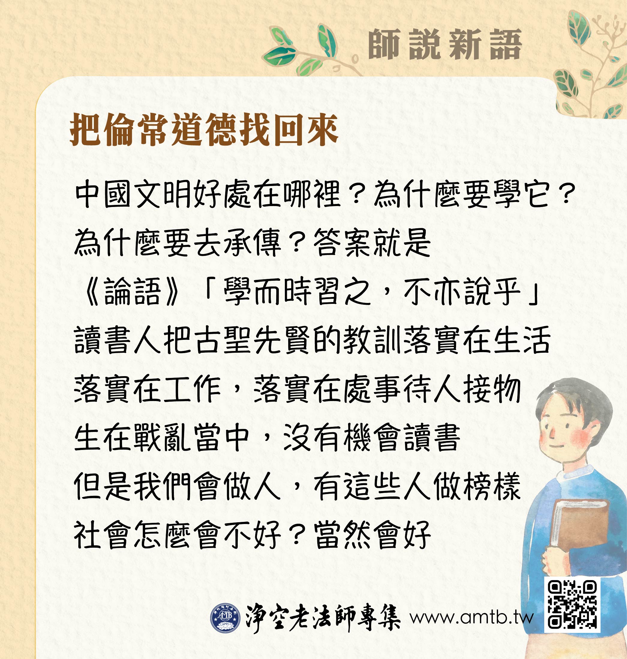 中國文明好處在哪裡?為什麼要學它?為什麼要去承傳?我覺得這個答案就是《論語》上的第一句,「學而時習之,不亦說乎」,這個答案就非常的圓滿。人活在世間,我們總希望自己這一生能夠過快樂幸福的生活,和諧家庭,家和萬事興。把倫常道德找回來,家文化。所以中國人確確實實,中國讀書人把讀書擺在第一位。