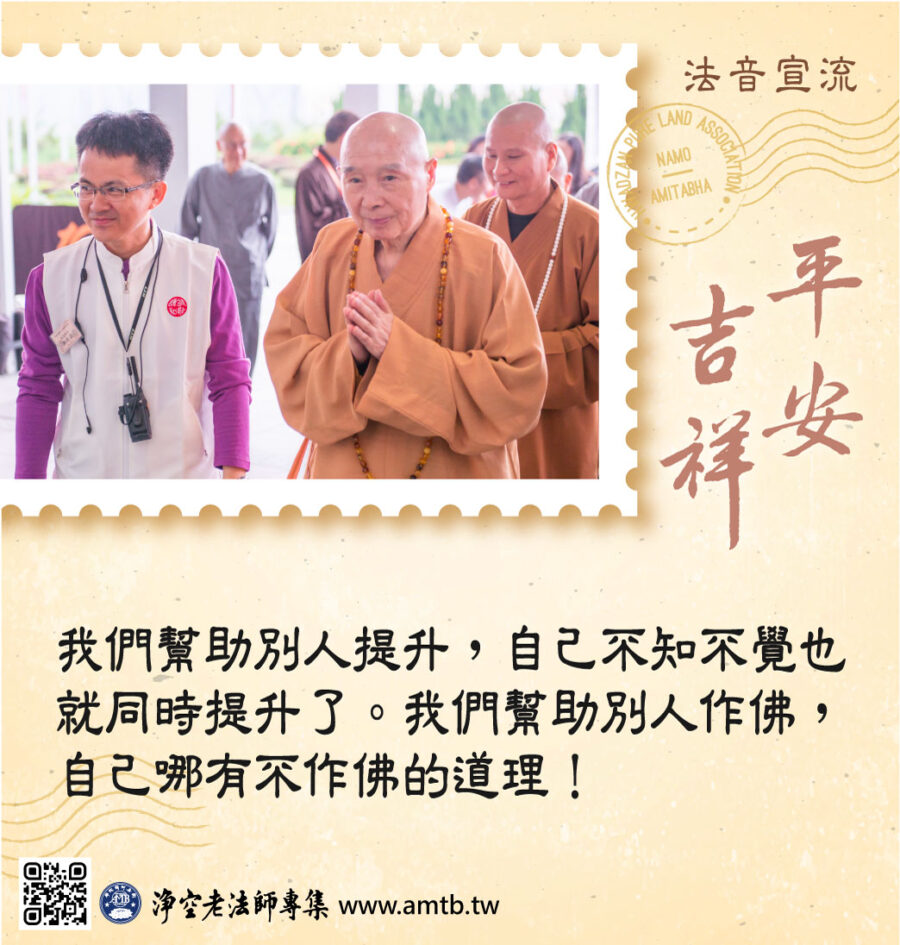 因此,我們必須天天聽經、念佛,吸收佛菩薩的氣氛。二六時中,佛號不斷,心中只念阿彌陀佛。除此之外,不掛礙任何事物。保持心地清淨,不夾雜絲毫的不善、染污。心地純淨,行為純善,以純淨、純善的心行,便可高品位往生西方極樂世界。21-116